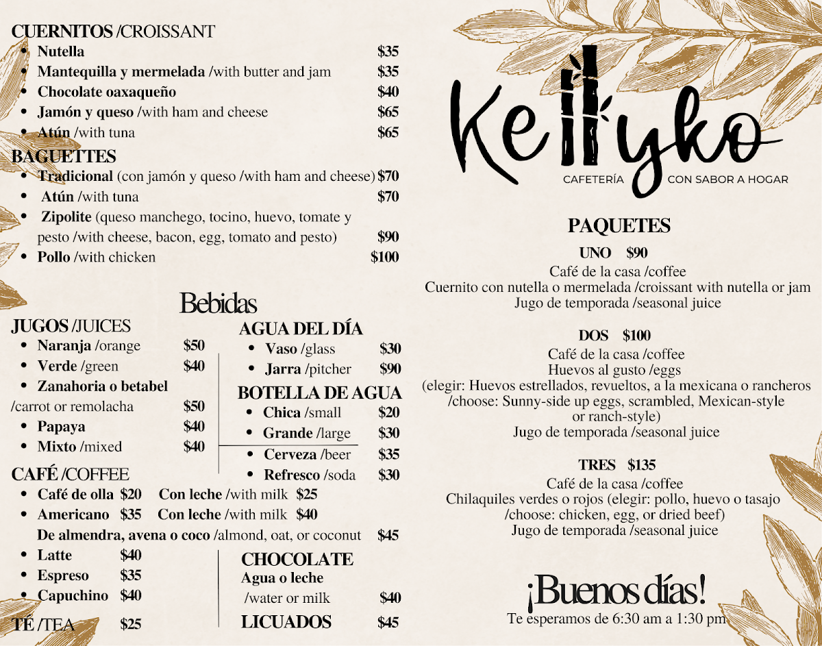 Kellyko’s menu is a treasure trove of delicious options, featuring favorites such as the Baguette Baguette Zipolite, a local twist on a classic, and the comforting Café de olla, a traditional Mexican coffee brewed with cinnamon and piloncillo. For those hungry for a hearty start to the day, the packages like Paquete 3 deliver excellent value with generous portions. Diners rave about the vegetarian omelet, which has received high praise for its flavor and freshness. On top of that, many guests can't resist the allure of the unique entomatadas and enfrijoladas, highlighted by customer favorites for their remarkable taste and quality.